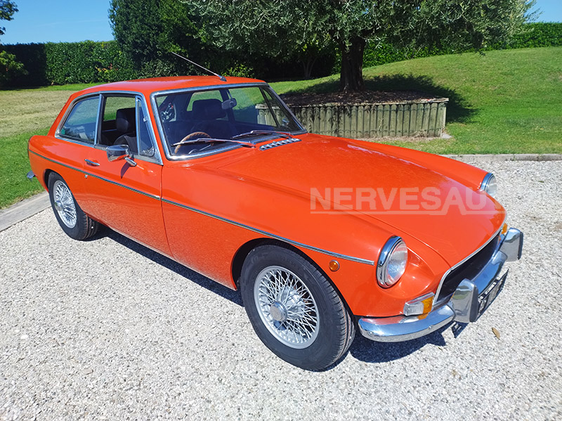 Beautiful 1972 MG B GT finished in orange, a color far more vivid in person than photos can show. The car features black interior, wire wheels, Motolita steering wheel, oil cooler, brake servo, and overdrive.